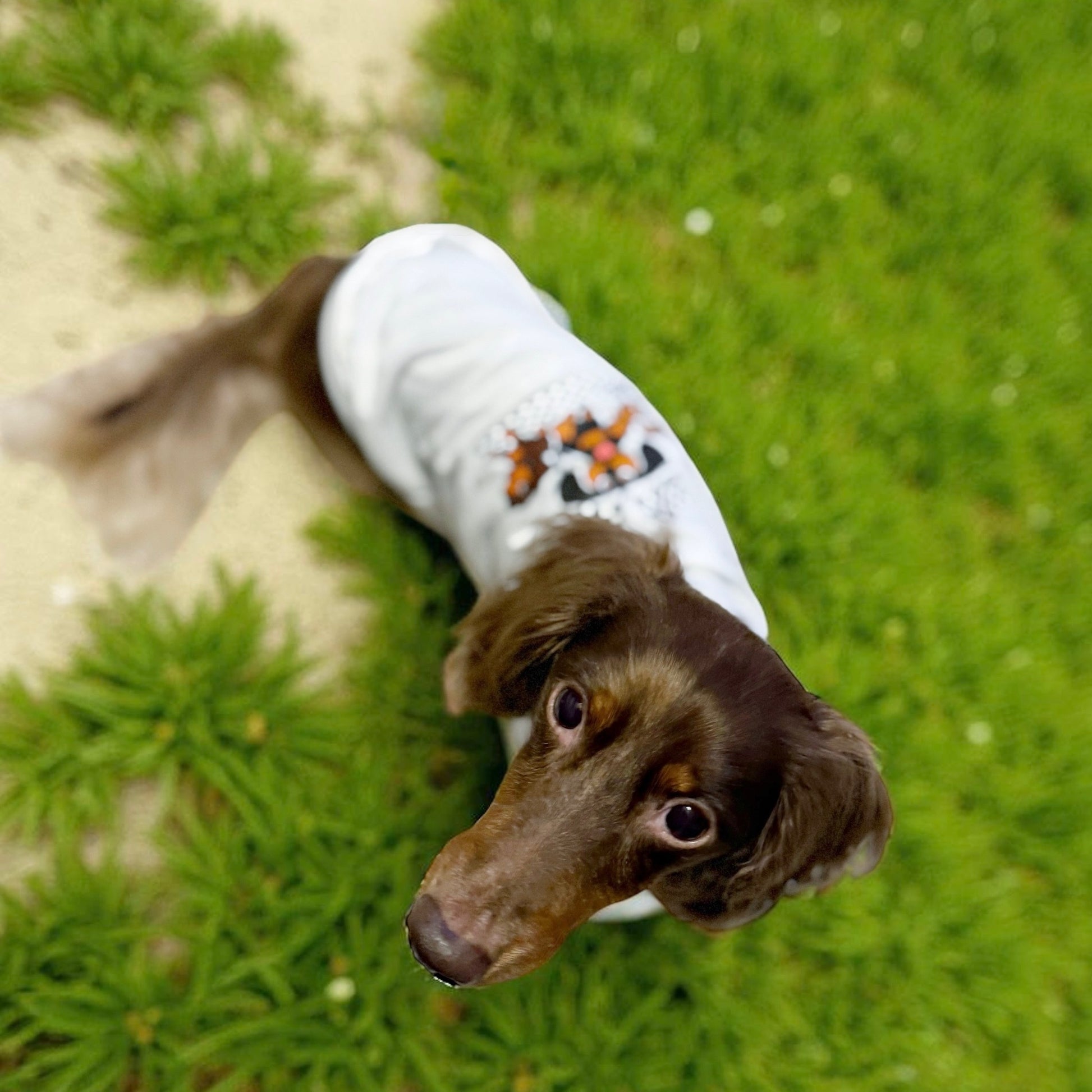 • tiny/mini dachshunds (up to approx 10 lbs) typically wear a size small